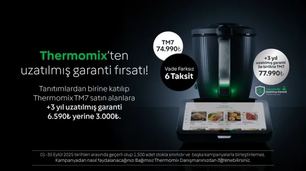 Eylül ayına özel sunulan Thermomix TM7 kampanyası, hem fiyat hem de garanti avantajı ile öne çıkıyor. Normalde yüksek maliyetli olan uzatılmış garanti, sadece bu aya özel indirimli olarak sunuluyor. Ayrıca vade farksız 6 taksit imkanı sayesinde cihazı bütçenizi yormadan satın alabilirsiniz.